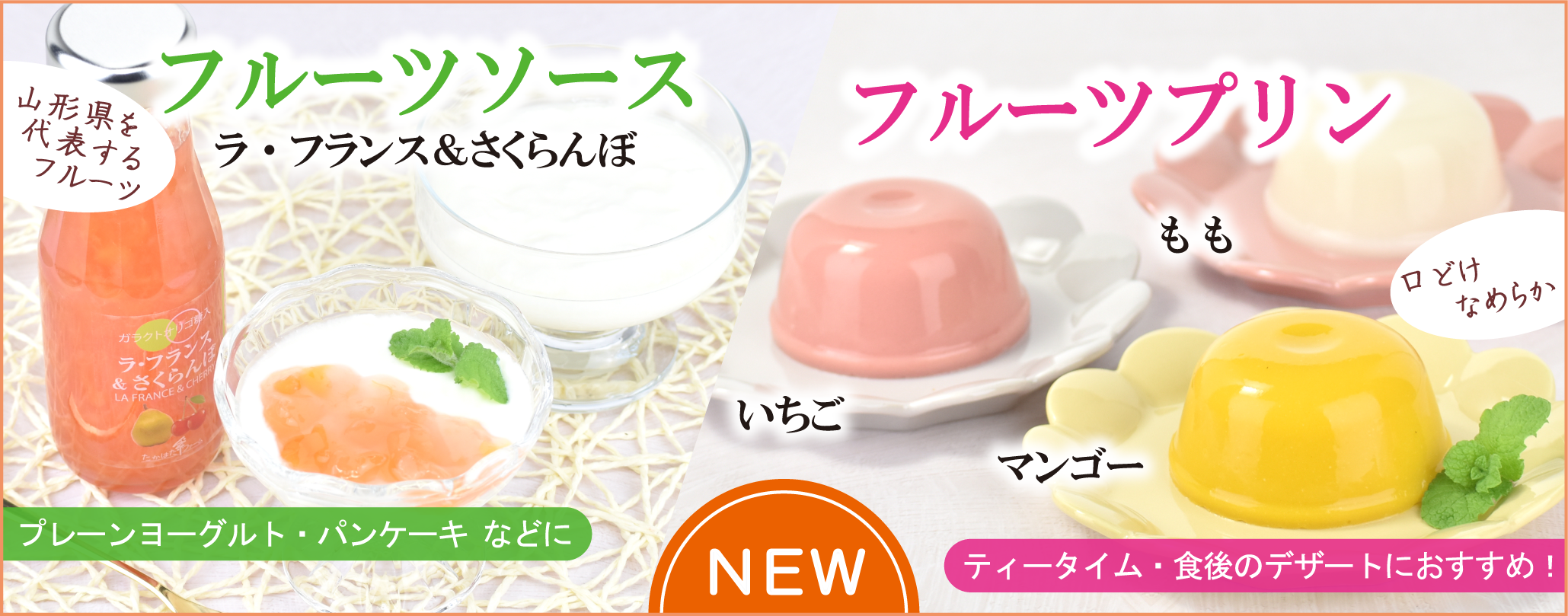 ホーム お知らせ一覧 2025年 新商品「フルーツソース215g ラ・フランス&さくらんぼ」と「フルーツプリン95g 3種類」のご案内 お知らせ 2025.10.23 新商品「フルーツソース215g ラ・フランス&さくらんぼ」と「フルーツプリン95g 3種類」のご案内 新商品『フルーツソース215g ラ・フランス&さくらんぼ』と『フルーツプリン95g 3種類』を発売いたします! ぜひお試しください。 2025年10月23日(木)から出荷開始