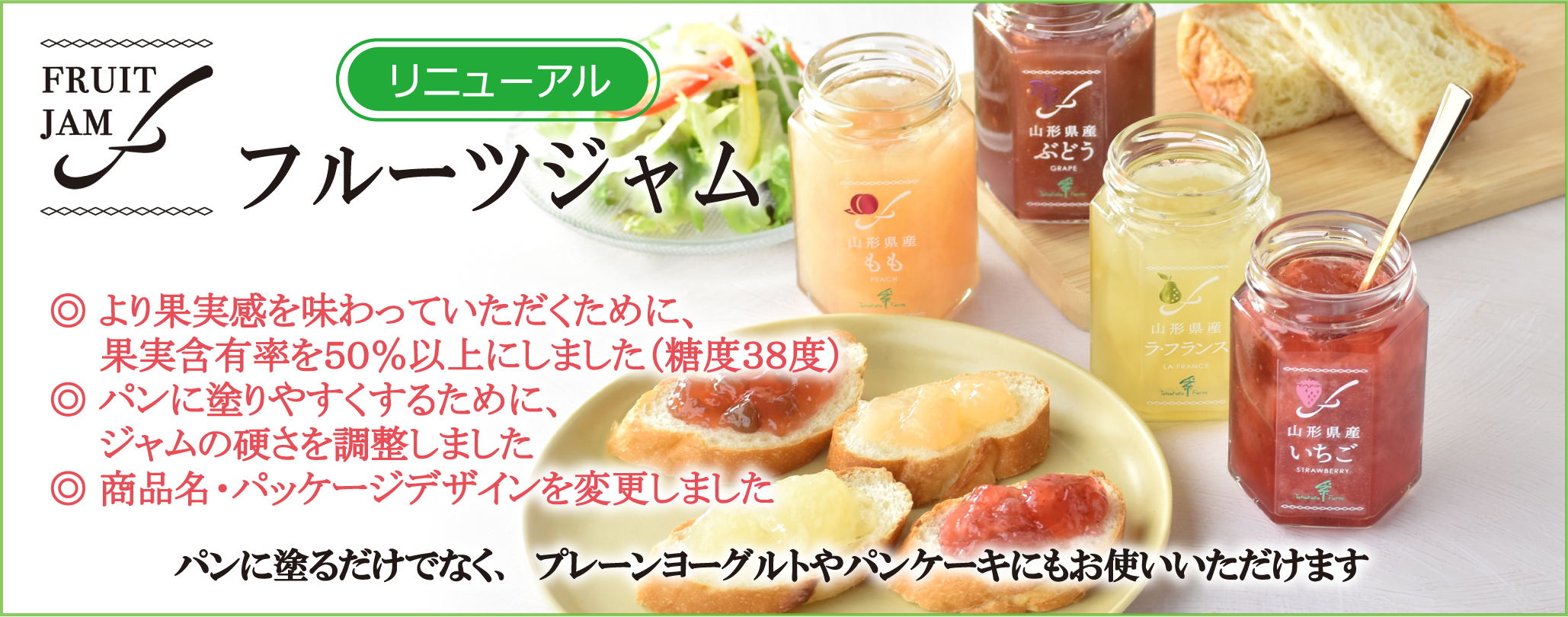 ホーム お知らせ一覧 2026年 「フルーツジャム」リニューアル発売のご案内 お知らせ 2026.02.02 「フルーツジャム」リニューアル発売のご案内 『フルーツジャム』リニューアル発売いたします!(ジャム55g・145g・290g) ぜひお試しください。 2026年2月2日(月)から出荷開始